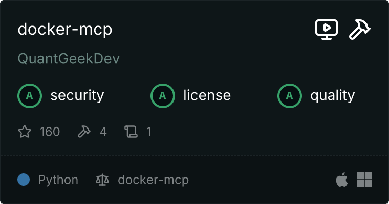 This PR adds a badge for the docker-mcp server listing in Glama MCP server directory. <a href="https://glama.ai/mcp/servers/8tdzip0z5a"><img width="380" height="200" src="https://glama.ai/mcp/servers/8tdzip0z5a/badge" alt="docker-mcp MCP server" /></a> Glama performs regular codebase and documentation scans to: * Confirm that the MCP server is working as expected * Confirm that there are no obvious security issues with dependencies of the server * Extract server characteristics such as tools, resources, prompts, and required parameters. This badge helps your users to quickly asses that the MCP server is safe, server capabilities, and instructions for installing the server.