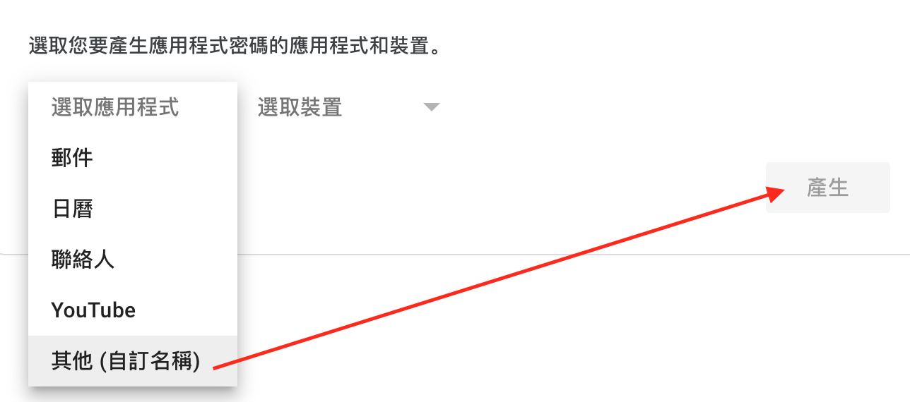 - 選擇 其他(自訂名稱),隨意填入名稱可辨識為何種用途即可,點選產生