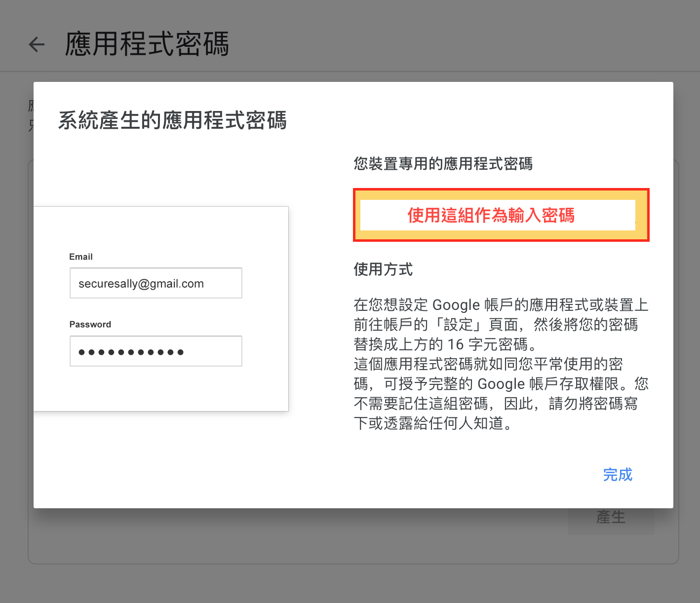 - 此時會跳出 系統產生的應用程式密碼 視窗,記下此組密碼,此組密碼即在使用 mail handler 時所需的 password